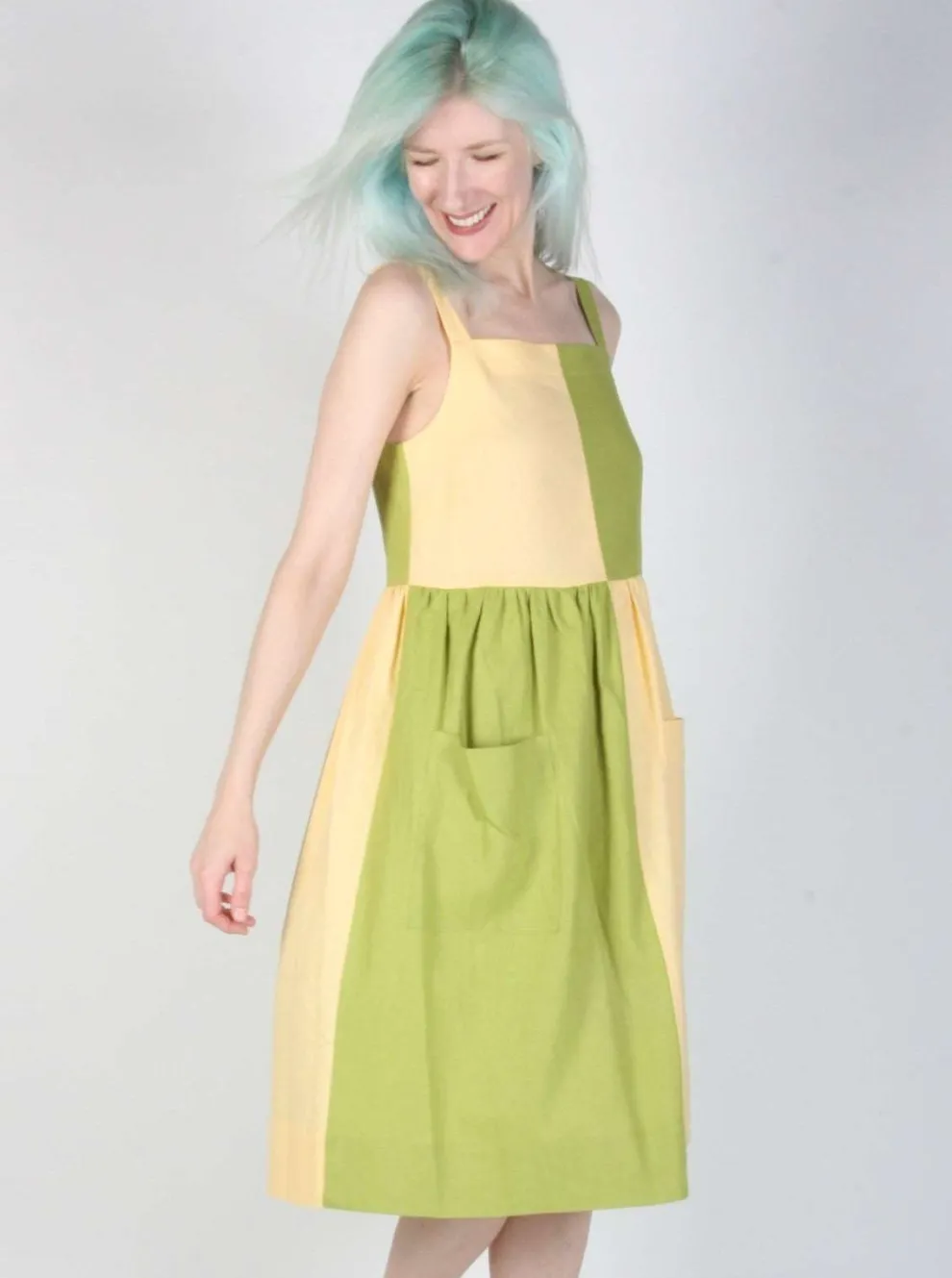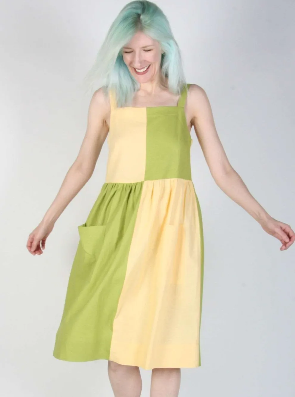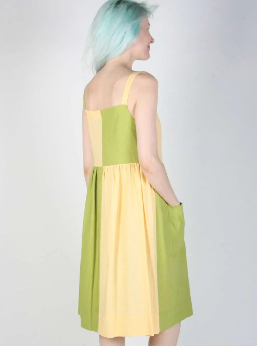 The Timber Doodle dress is the most playful dress in the new BIRDS OF NORTH AMERICA collection with its pastel colors and plaid pattern. It is made of a blend of linen and rayon. It slips easily over the head and has large front pockets.