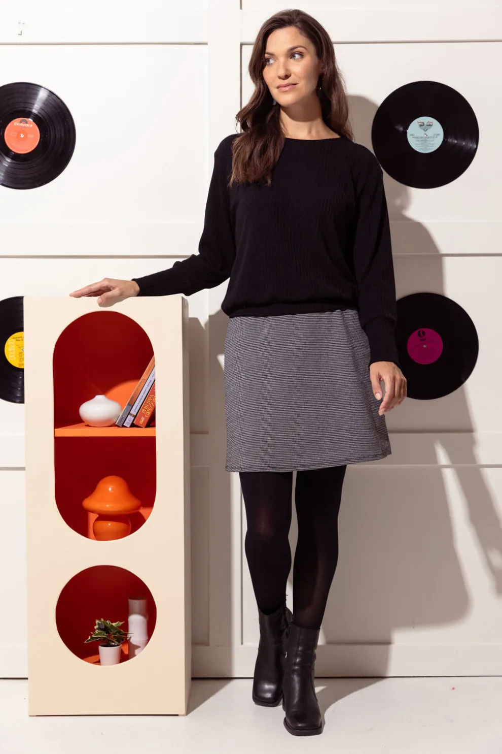The Zeppelin Sweater is a modern knit piece. Its batwing cut and long sleeves provide a relaxed silhouette, while the tighter waistband structures the silhouette for a balanced and refined look.