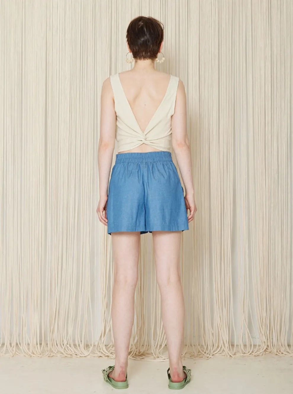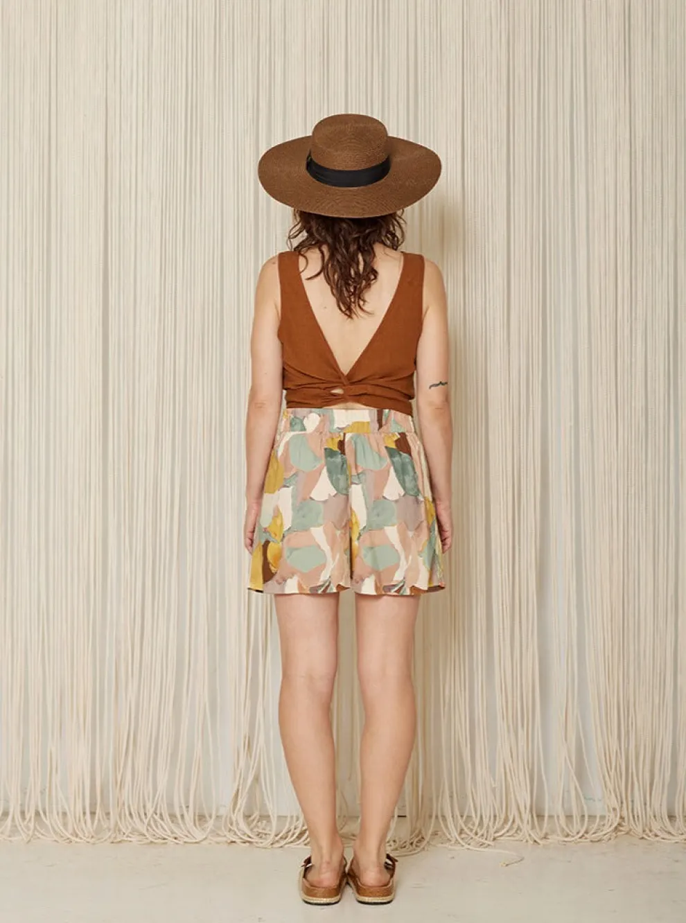 Slightly dropped short-sleeved top with button front. This top is a must-have that can be worn either closed or open with a camisole underneath.