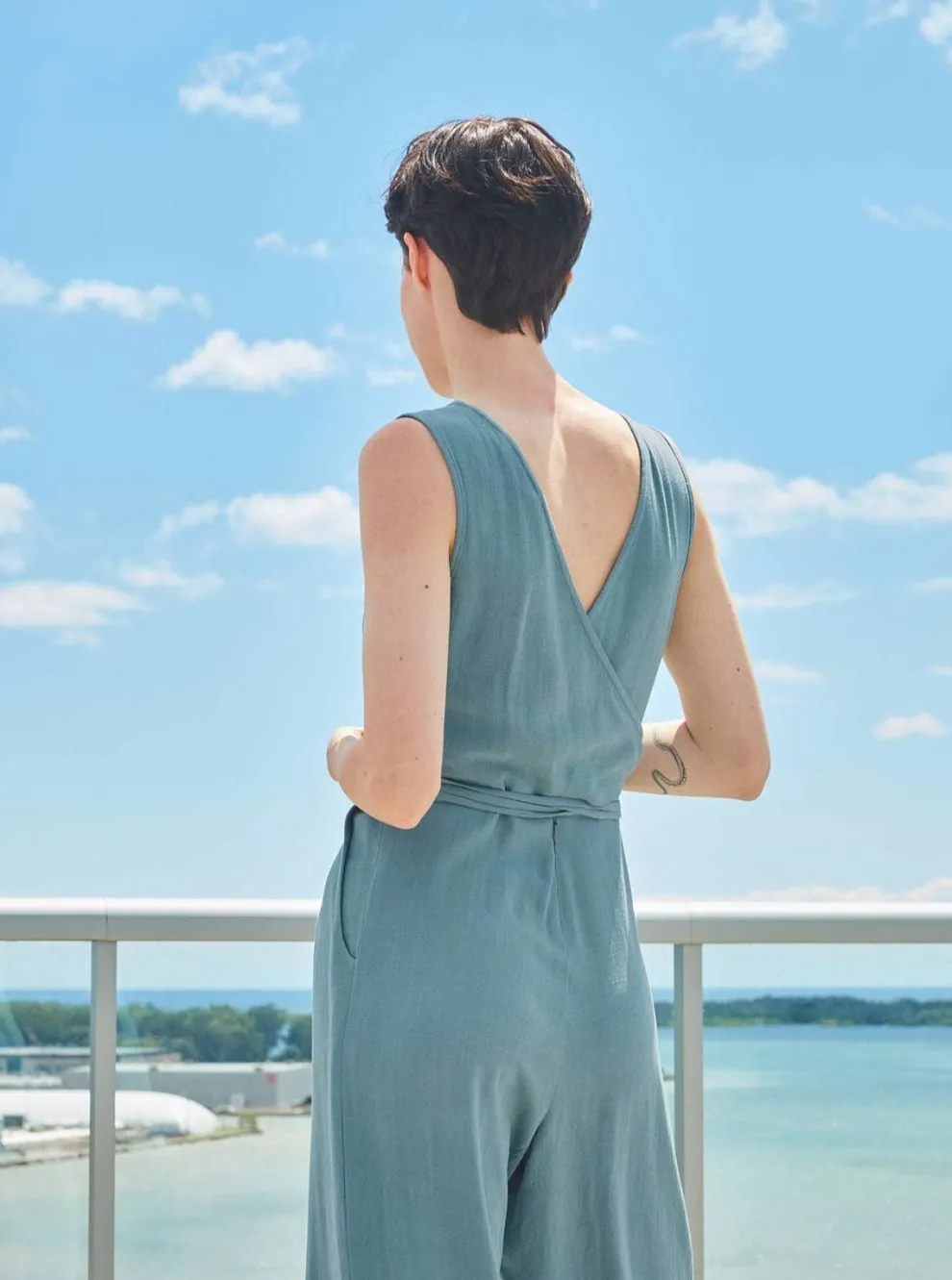 Simple, lightweight jumpsuit that crosses at the back and ties at the front. The jumpsuit has pockets and the leg is wide.