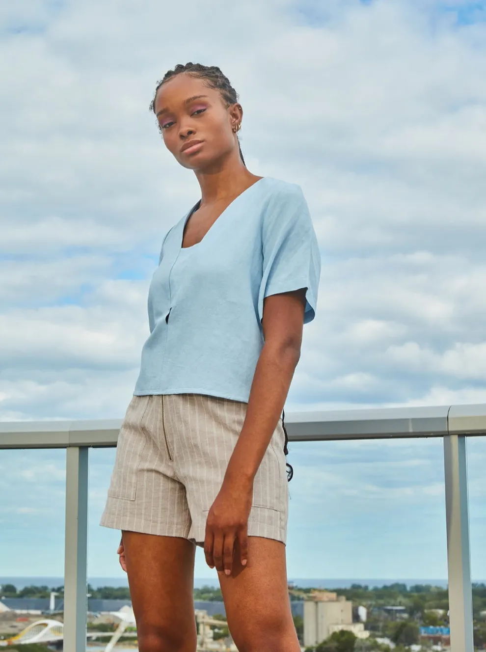 Reversible top with a round neck on one side or a square neck on the other. The sleeves are puffy and come just below the elbow. The fabric is light, perfect for the approaching summer season!