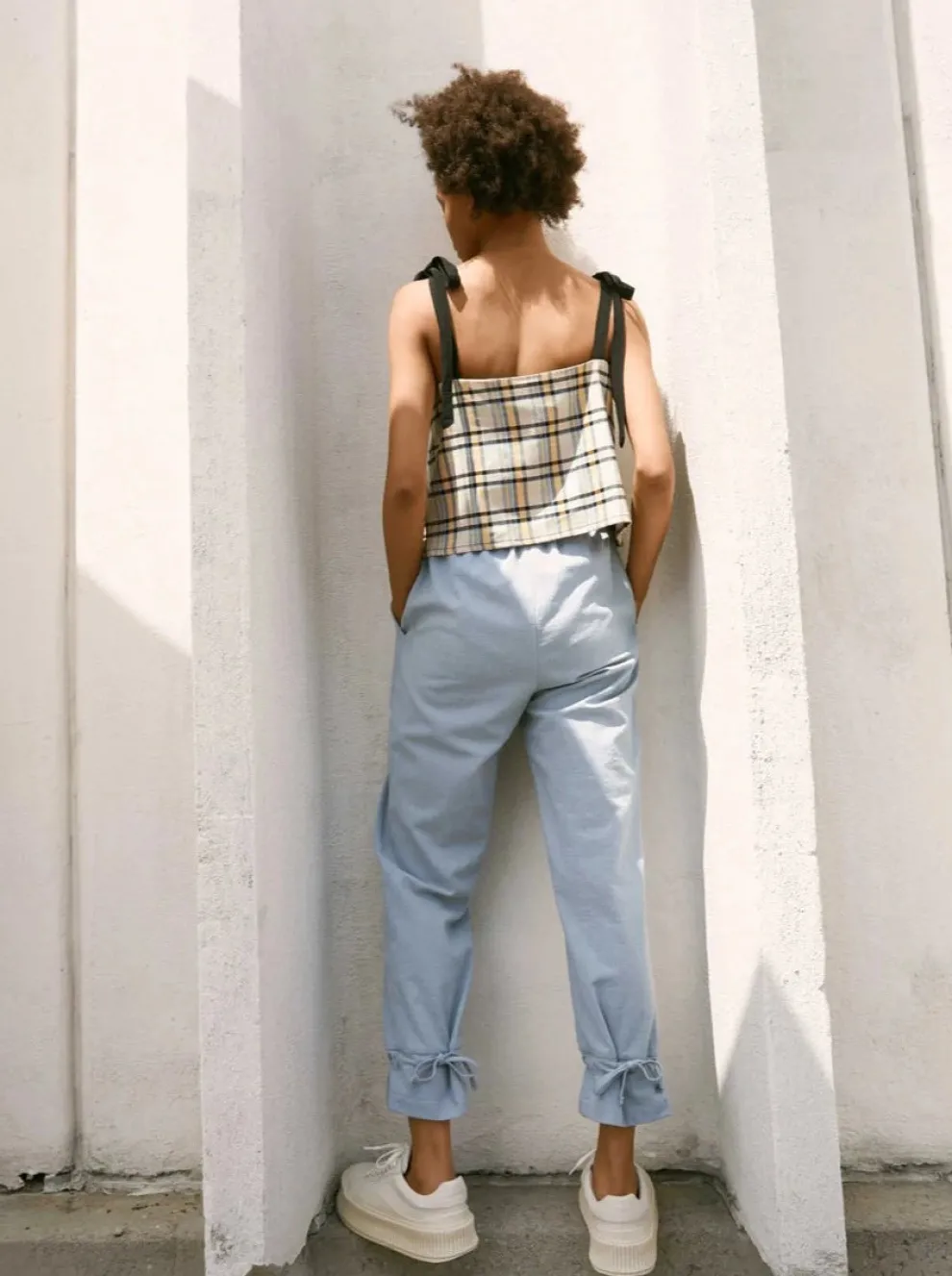 Pretty madras cropped camisole style top with wide straps tied at the shoulders. This camisole reveals the upper back for a flattering effect.