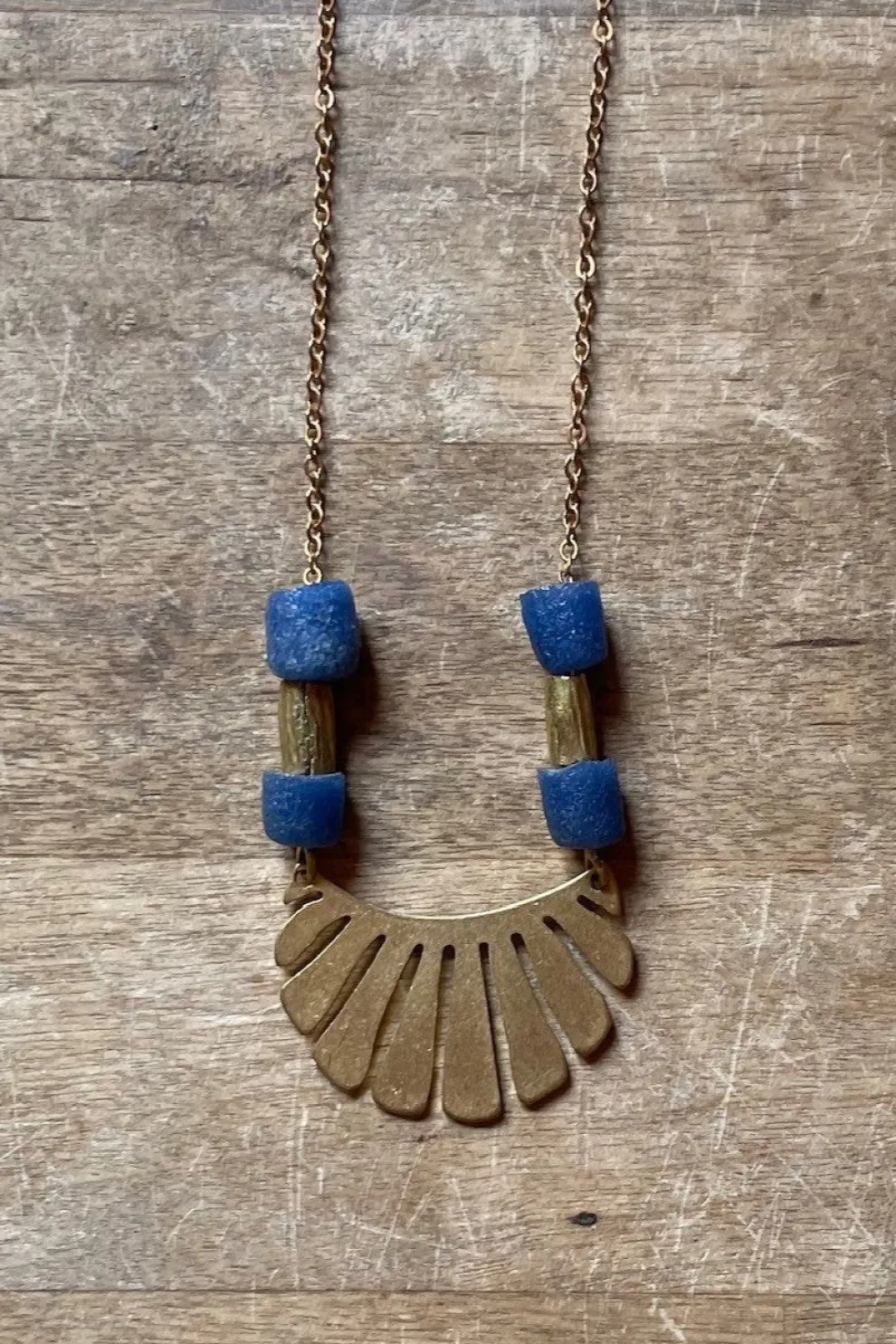 Brass necklace with brass parts and ceramic piece handmade in Africa.