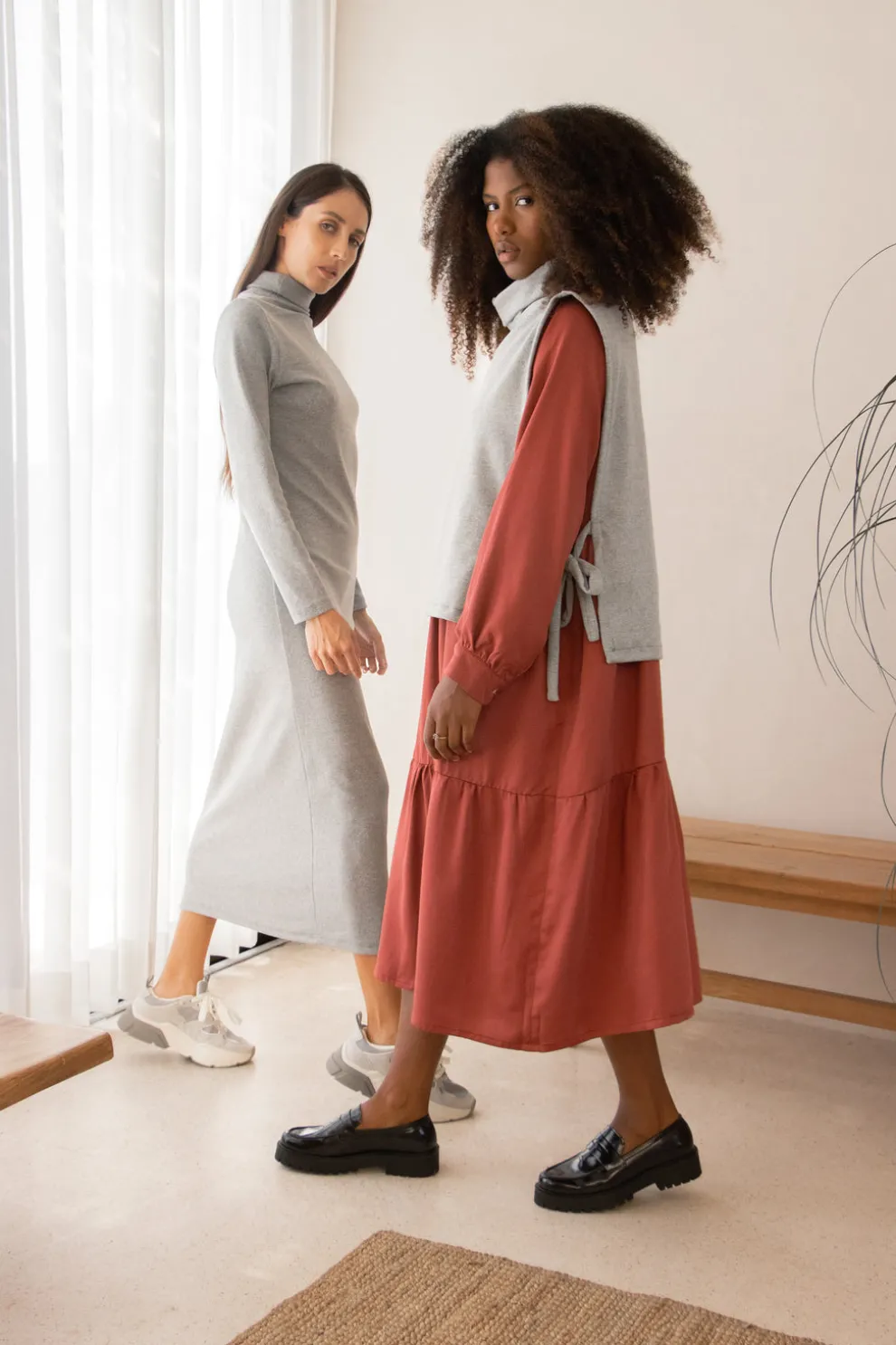 The apron style top, named TUNIS, is a versatile addition to your wardrobe. Designed to be a perfect layering piece or a stylish neck warmer under your coat, it is a must-have.