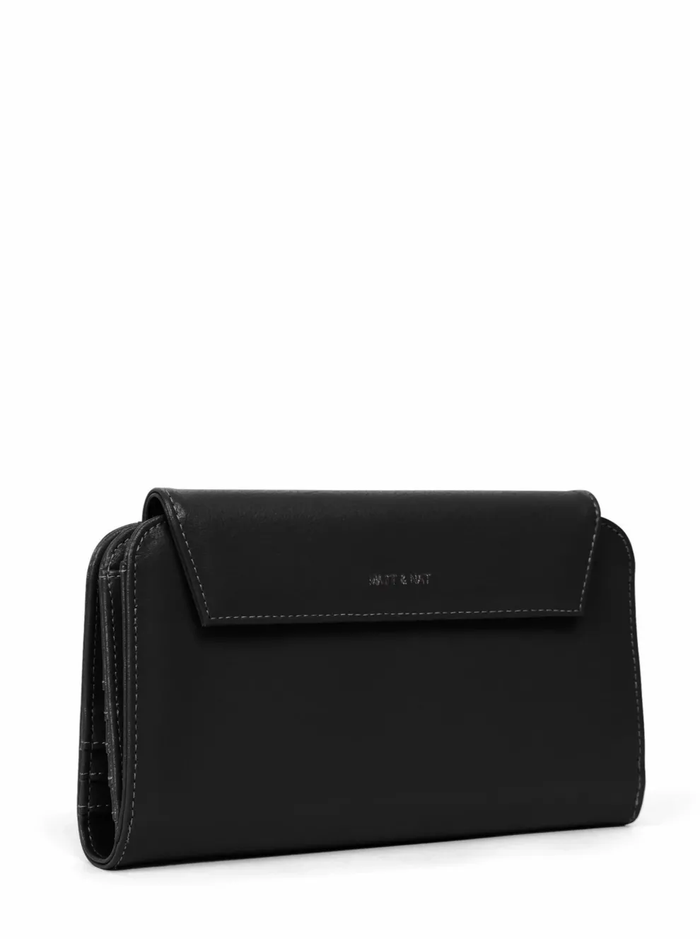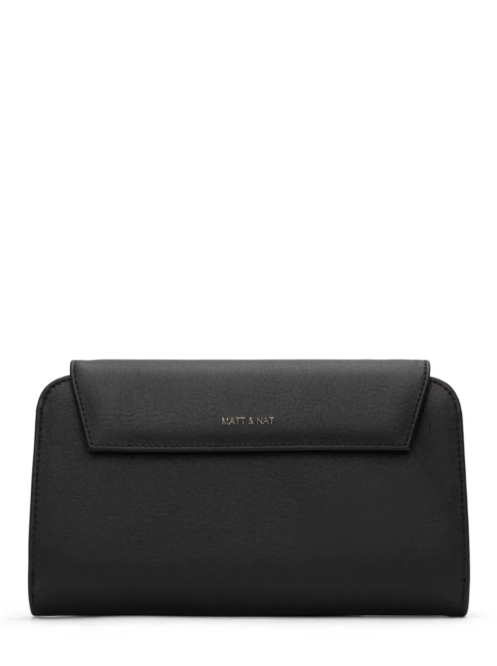Large folded wallet with snap closure, exterior front smartphone pocket with flap closure and an interior slip pocket. Fits an iPhone 13 Pro Max.