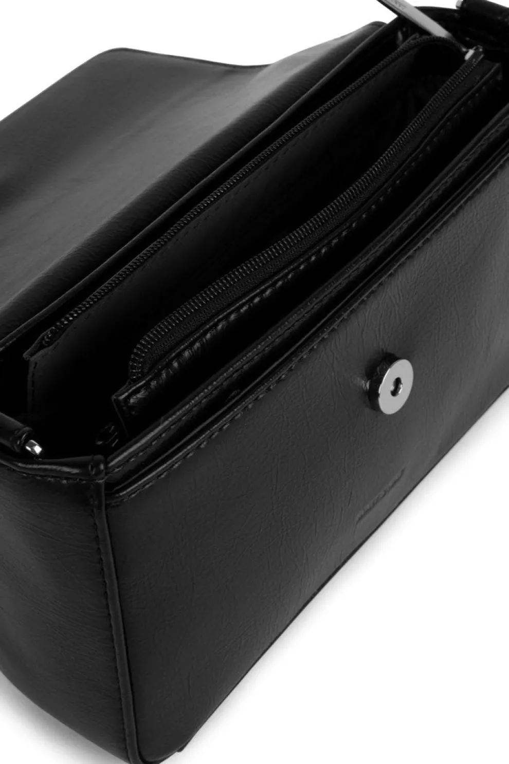 Shoulder bag with removable and adjustable shoulder strap, top handle, flap with zip closure around the main compartment, front slit pocket, and exterior back slit pocket with snap closure.
