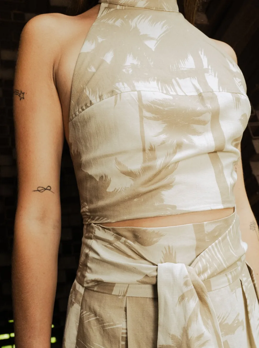 High neck, backless crop top. Adjustable at the waist with a bow. Closes at the neck with two transparent buttons.
