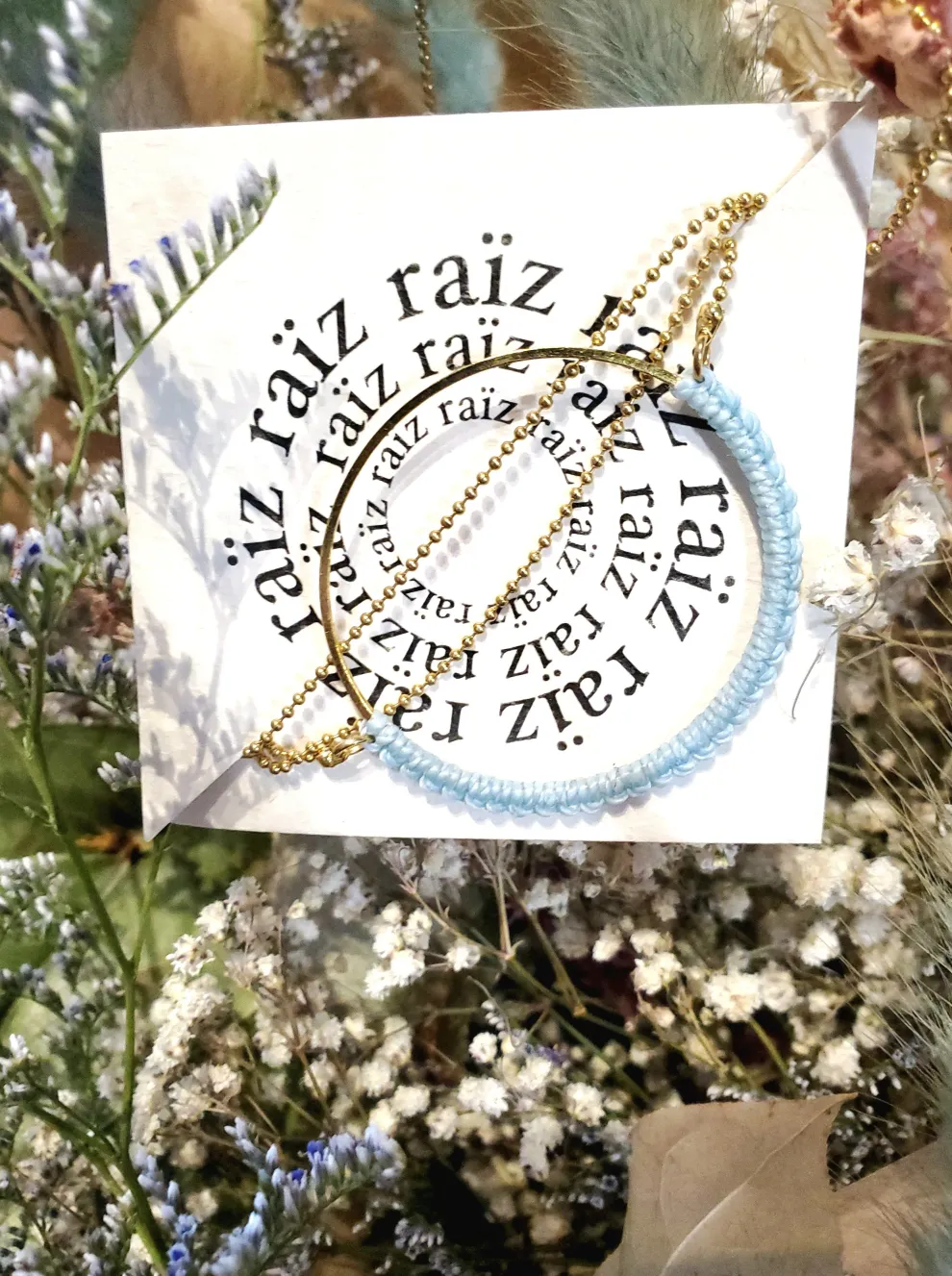 Pendant on a golden brass chain (pink color) or a stainless steel chain (blue color) with a circle adorned with a delicate, refined and minimalist textile detail made one tiny knot at a time using the micro-macrame technique .