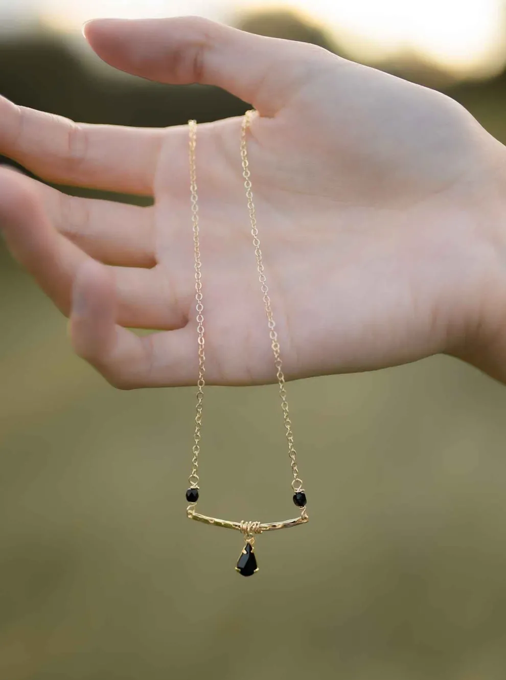 Delicate pearl-finish glass charm necklace mounted on a thin 14K gold-filled chain. With gold-plated pendant with a hammered finish.