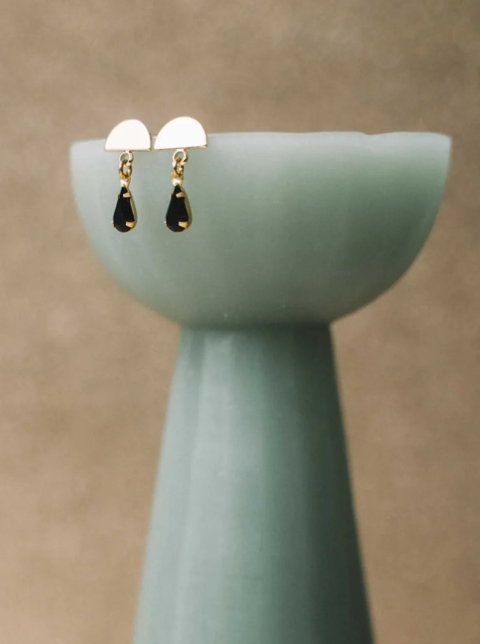Half-circle earrings on stem with pink opal or black glass drops (vintage cabochons). Gold-plated brass.