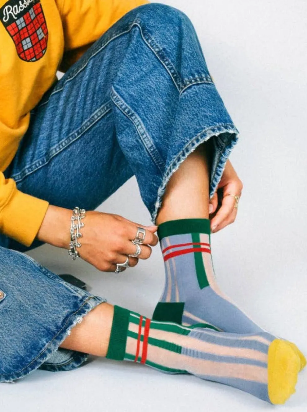 The Rosie Barker Pace Sock is a nylon ankle-length style with a contrast ruffled cuff and a pattern inspired by Rose’s cut and stitched quilted pieces.