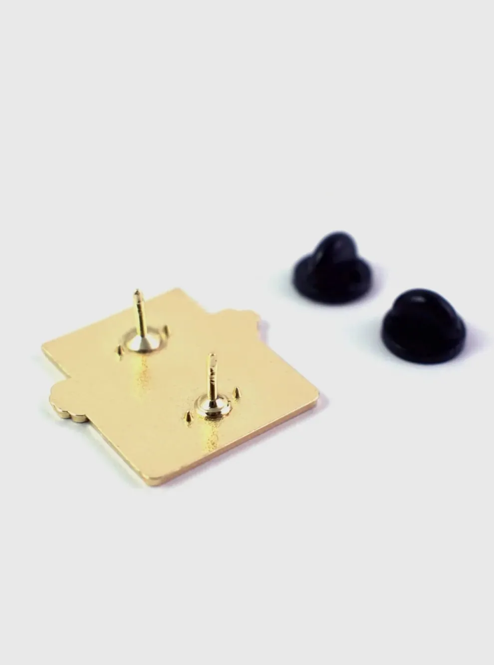 Soft enamel pin with gold outline, backing and rubber sleeve.