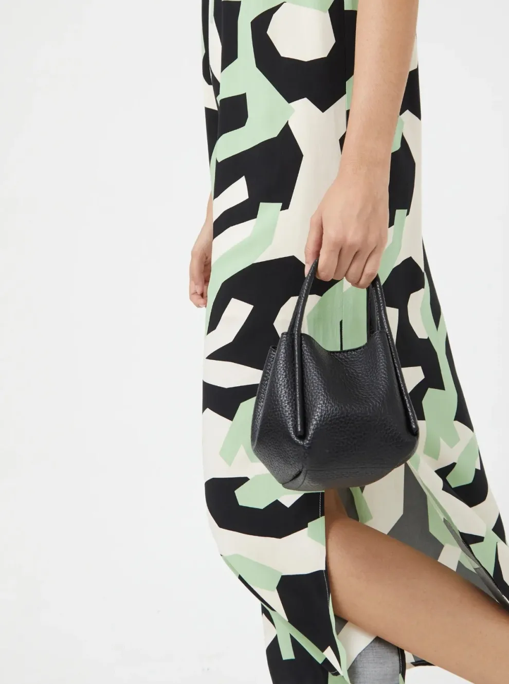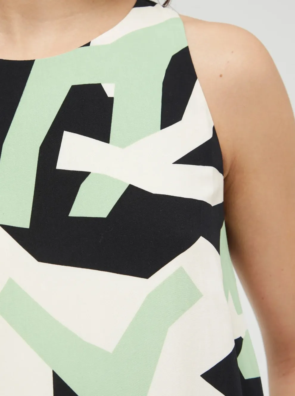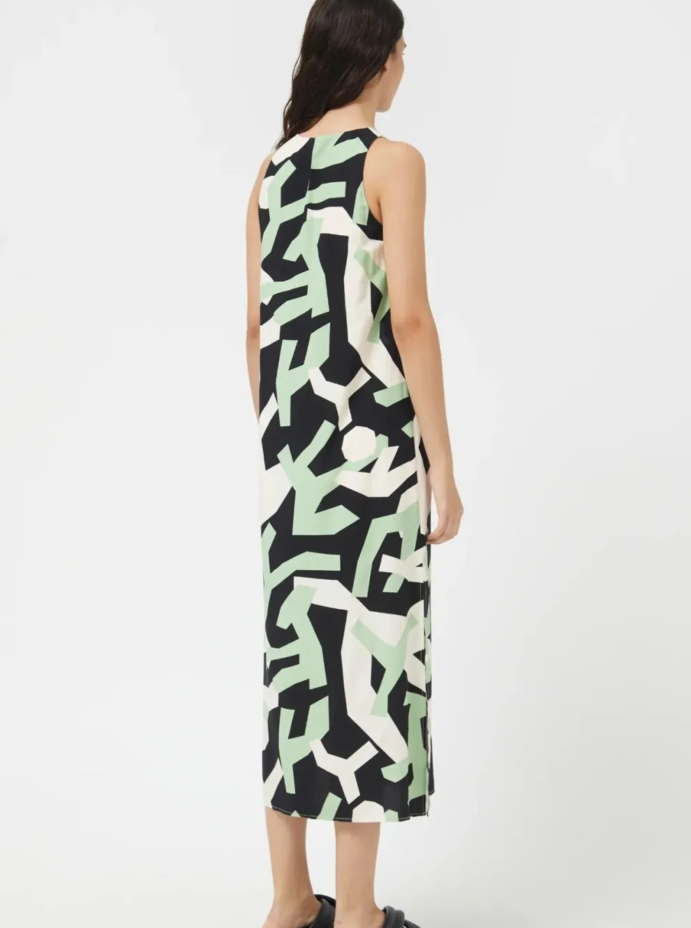 Long dress with geometric print. With a round neck and wide straps. Straight cut model with side slits. Back closure with slit and button. Interior lining.