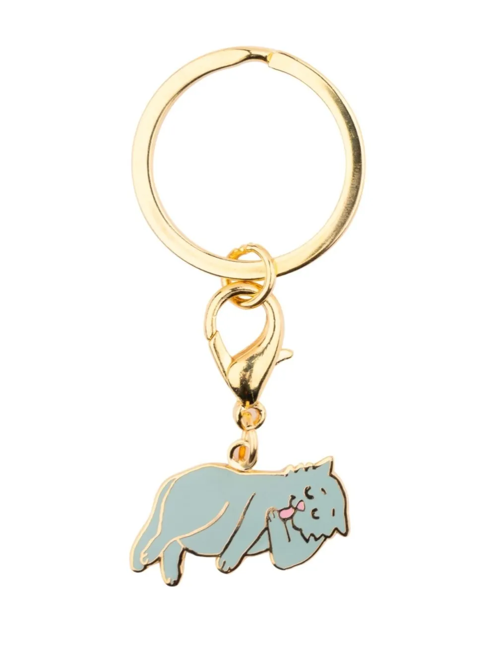 A pretty key ring in the shape of a cat that is grooming itself, and which can also be used as a medal to hang on your pet’s collar.