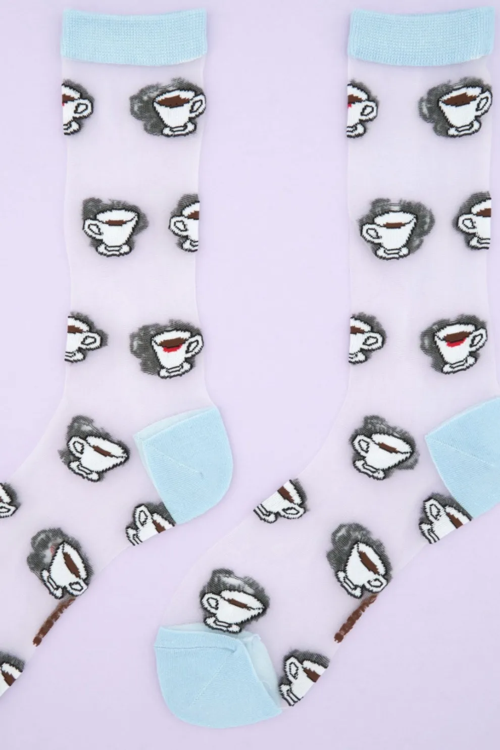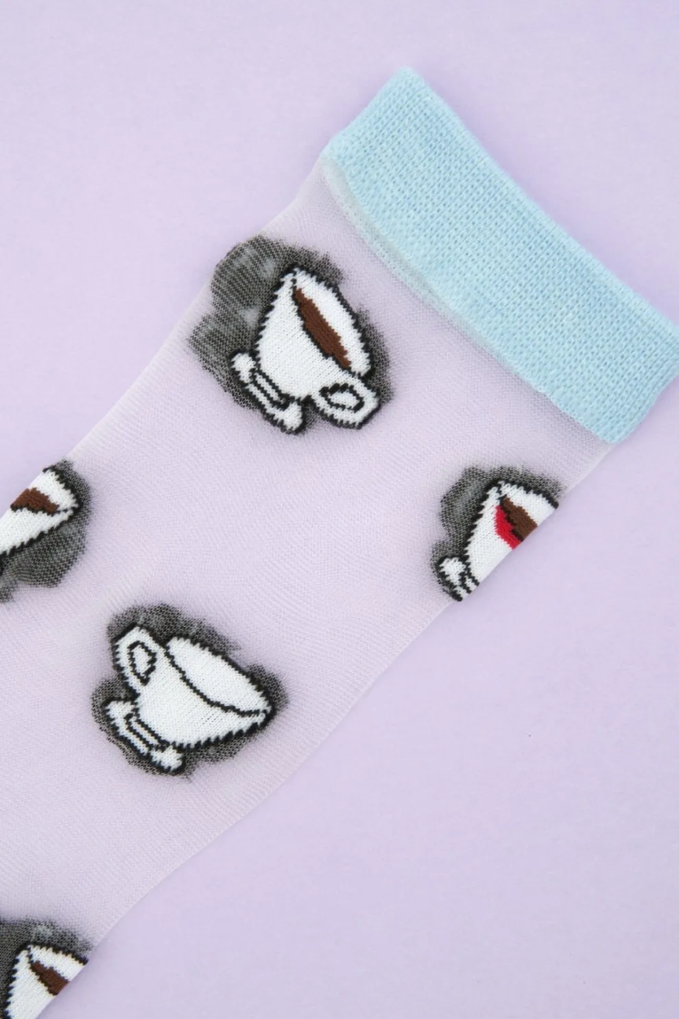 Sheer socks with a little coffee cup pattern. We love the detail of the lipstick marks, so typical, and its pretty sky blue ends.