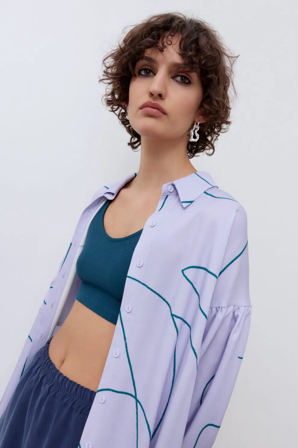 Eve Gravel’s iconic shirt. Loose short sleeves and right chest pocket. Perfect with a turtleneck underneath in winter or open with a bralette on sunny days. Collaborative print with artist Cassandra Jetten.