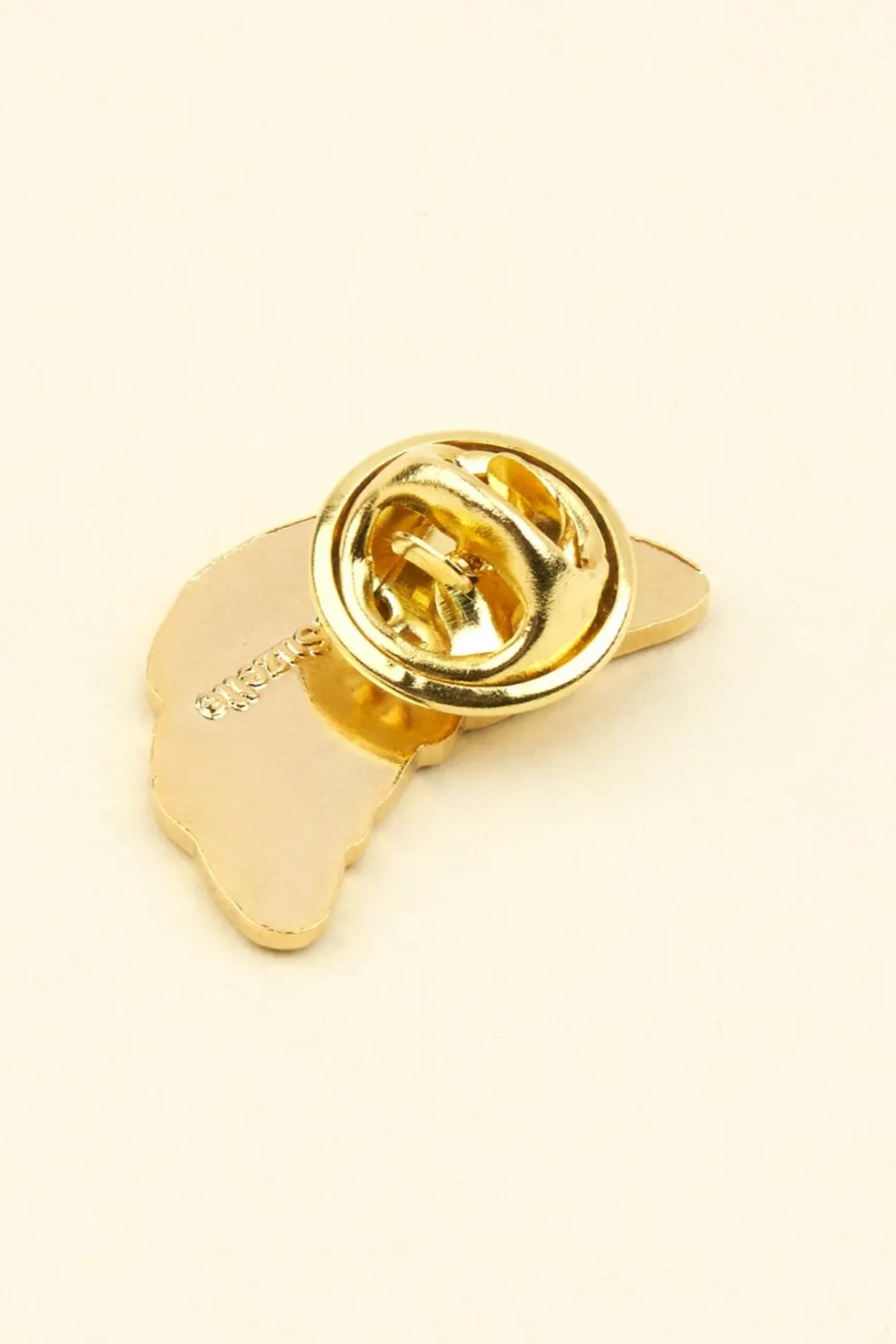 A small crescent shaped pin with pretty gold details that looks great on all jackets, dresses, bags and suspenders.
