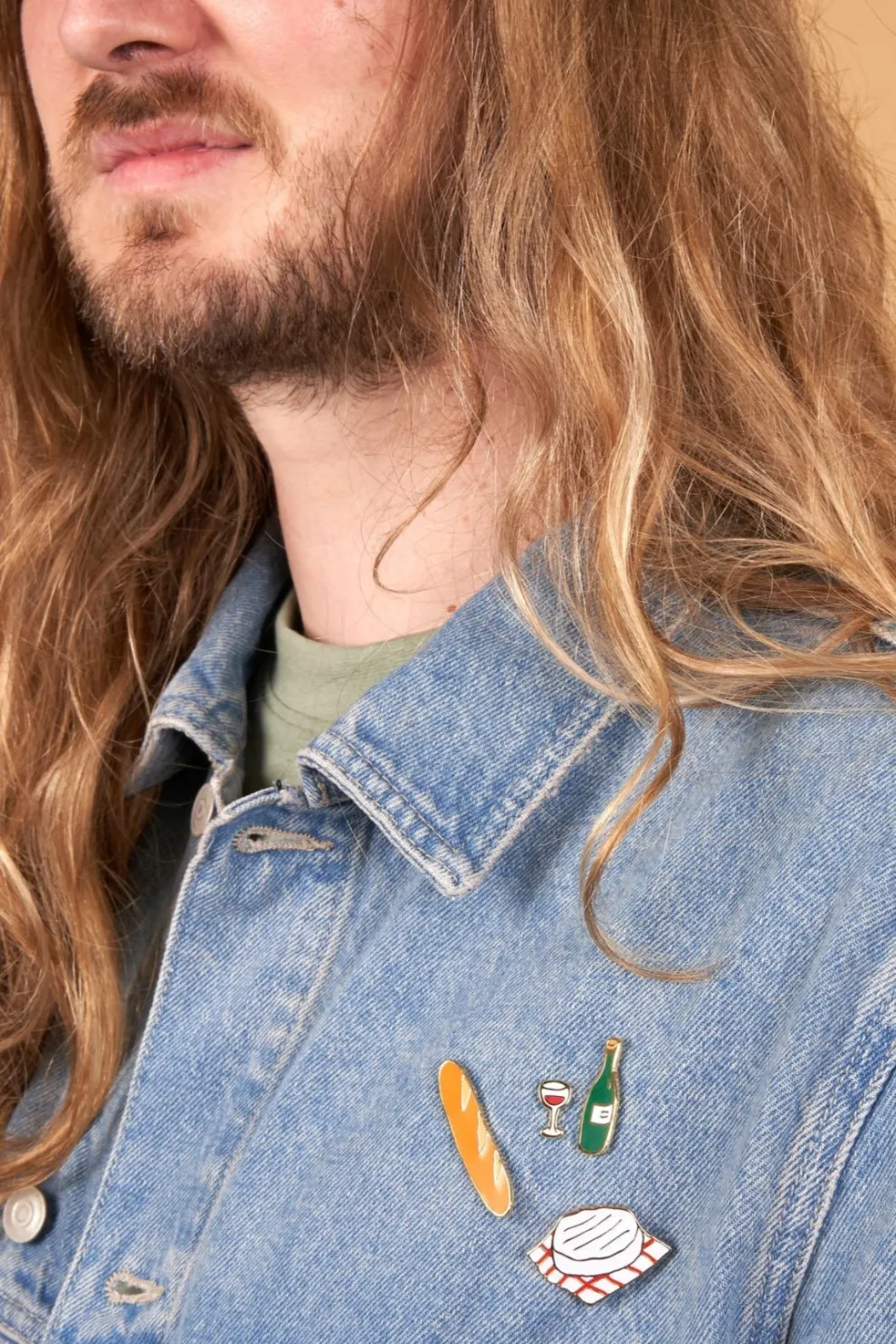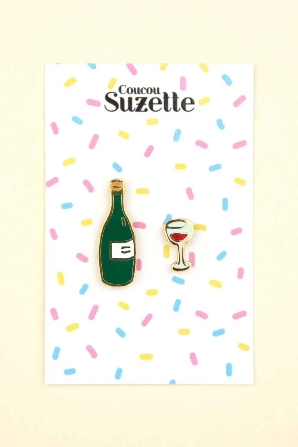 A set of the cutest pins, consisting of a good bottle of red, and a small stemmed glass, which is not on its first round. A small jewelry accessory that can be pinned with joy on all our outfits.