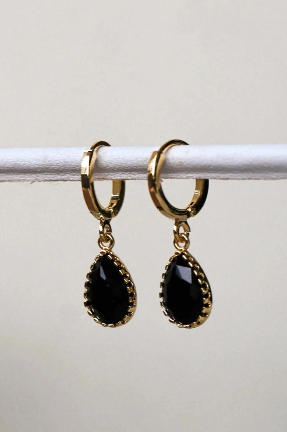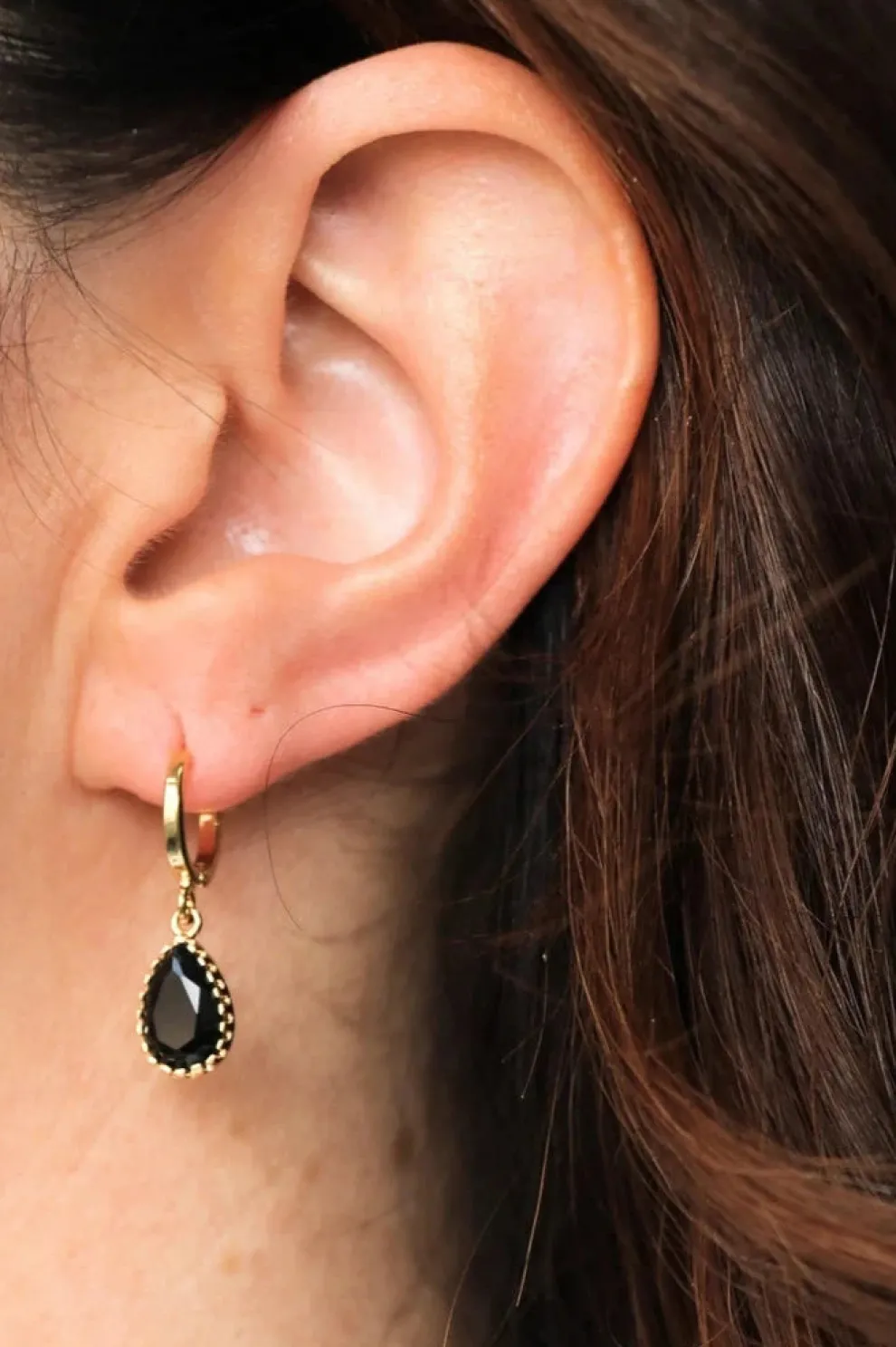 Sleeper earrings adorned with a black glass stone drop pendant.