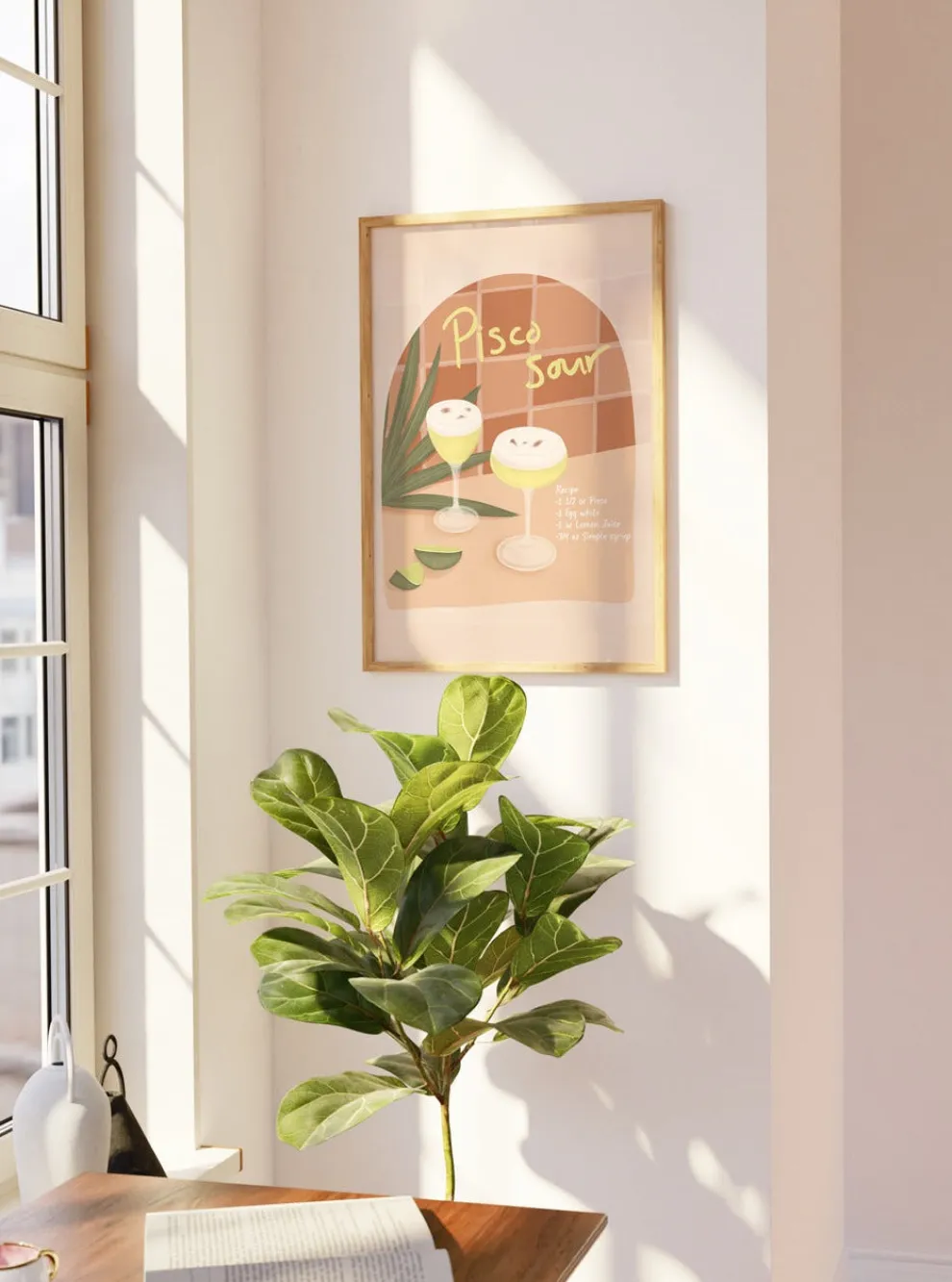 Enhance your bar or kitchen with this illustration beautifully showcasing Pisco Sour cocktails and the authentic recipe. This work of art not only adds a touch of South American elegance to your space, but it also serves as a handy guide to concocting the perfect Pisco Sour cocktail. Bring the spirit of Peru into your home and delight your guests with this unique fusion of art and mixology.