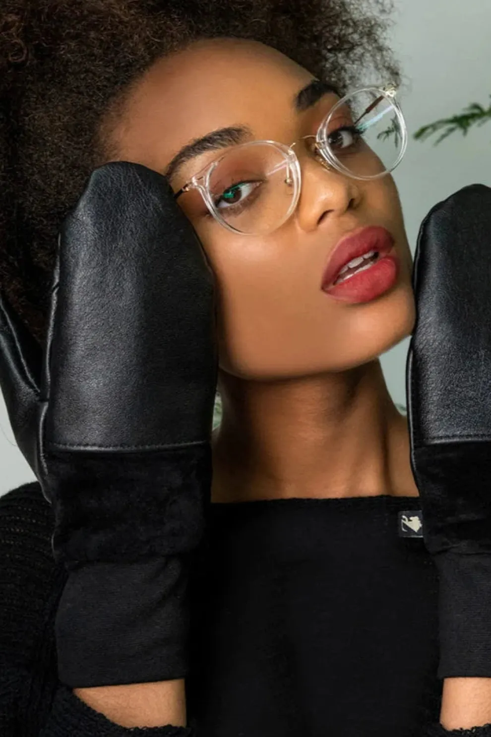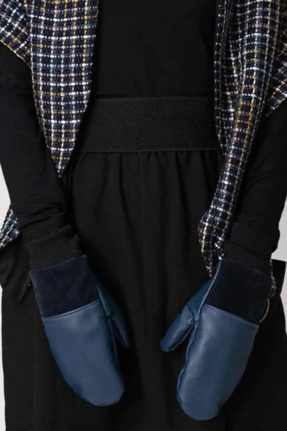 Pair of mittens made from recycled leather and suede, with ribbed cuffs.