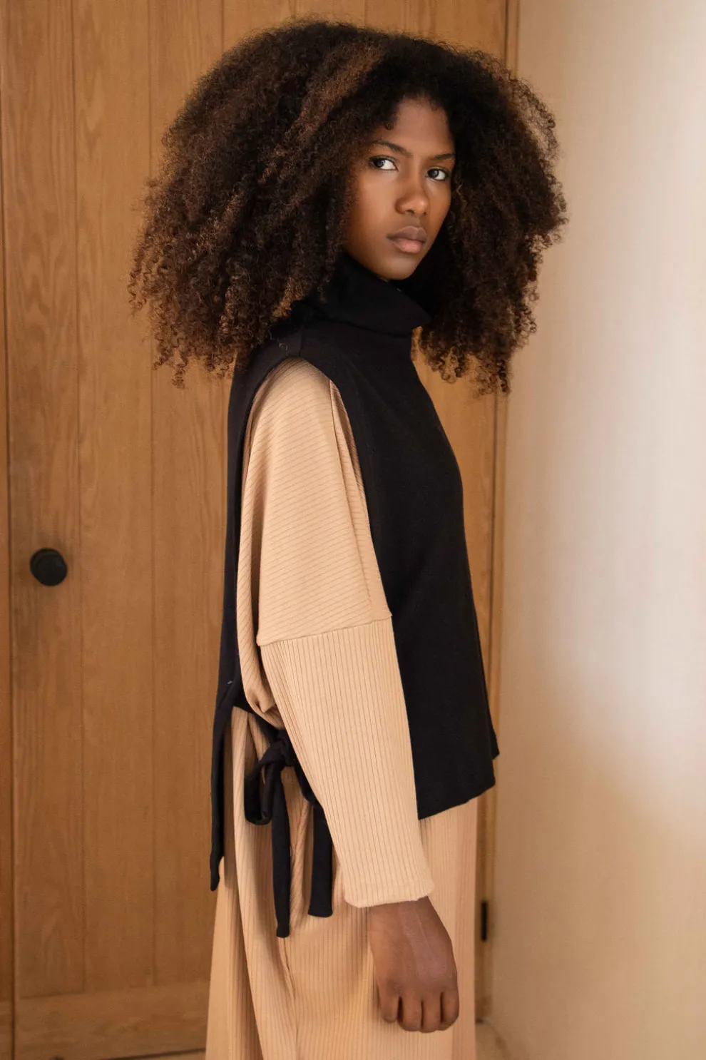 The apron style top, named TUNIS, is a versatile addition to your wardrobe. Designed to be a perfect layering piece or a stylish neck warmer under your coat, it is a must-have.