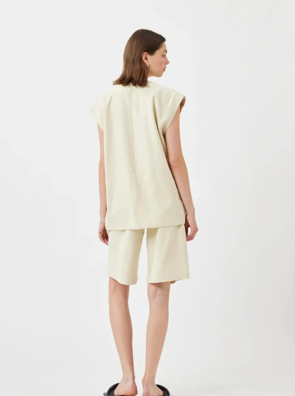 The Freas vest is a classic model in viscose and polyamide, featuring an open neckline and buttoned fastening.