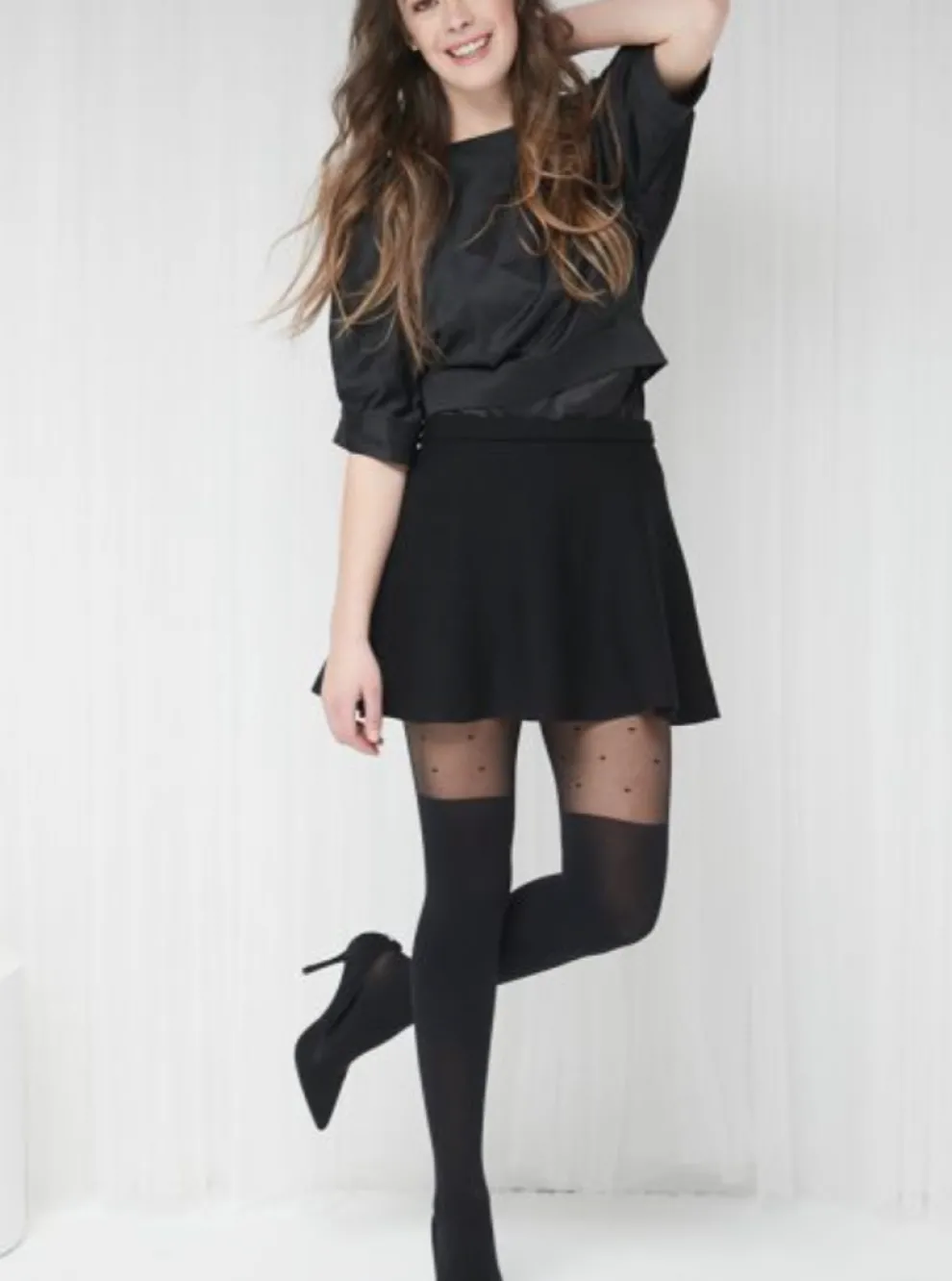 Fine tights with polka dot patterns above the knees. Elastic at the waist in lycra.