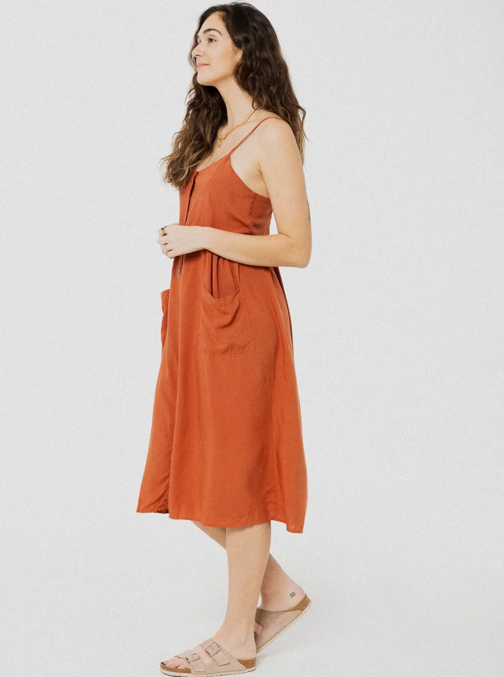 Bohemian dress at the bottom of the knees with elastic band at the back. Adjustable straps.