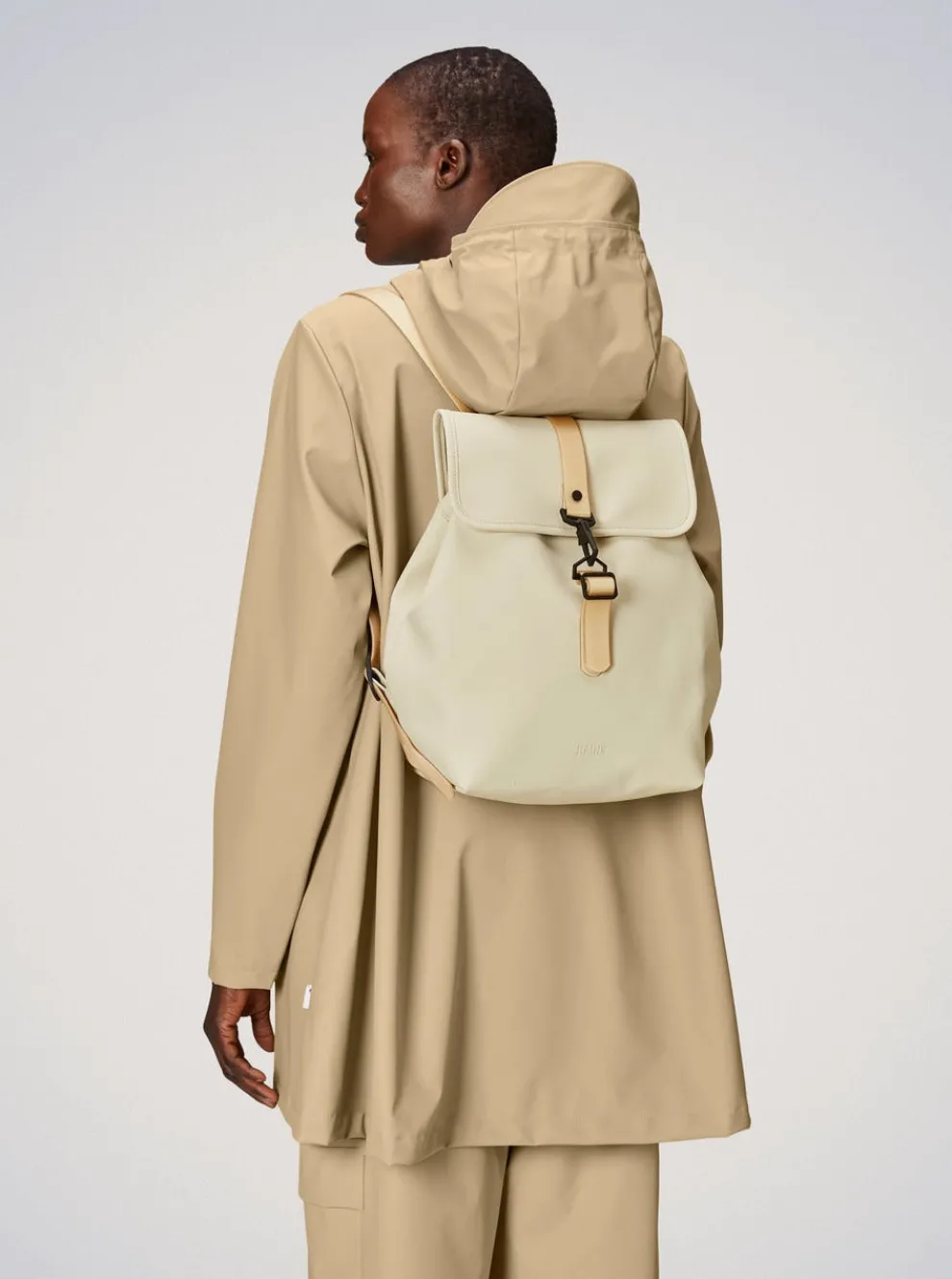 Waterproof backpack whose design is a square version of a classic backpack, reminiscent of a retro drawstring bag. The TPU back straps are attached to the side of the bag for a casual look. This bag has one main compartment with an interior zippered pocket for small items and features Rains’ signature carabiner buckle closure.