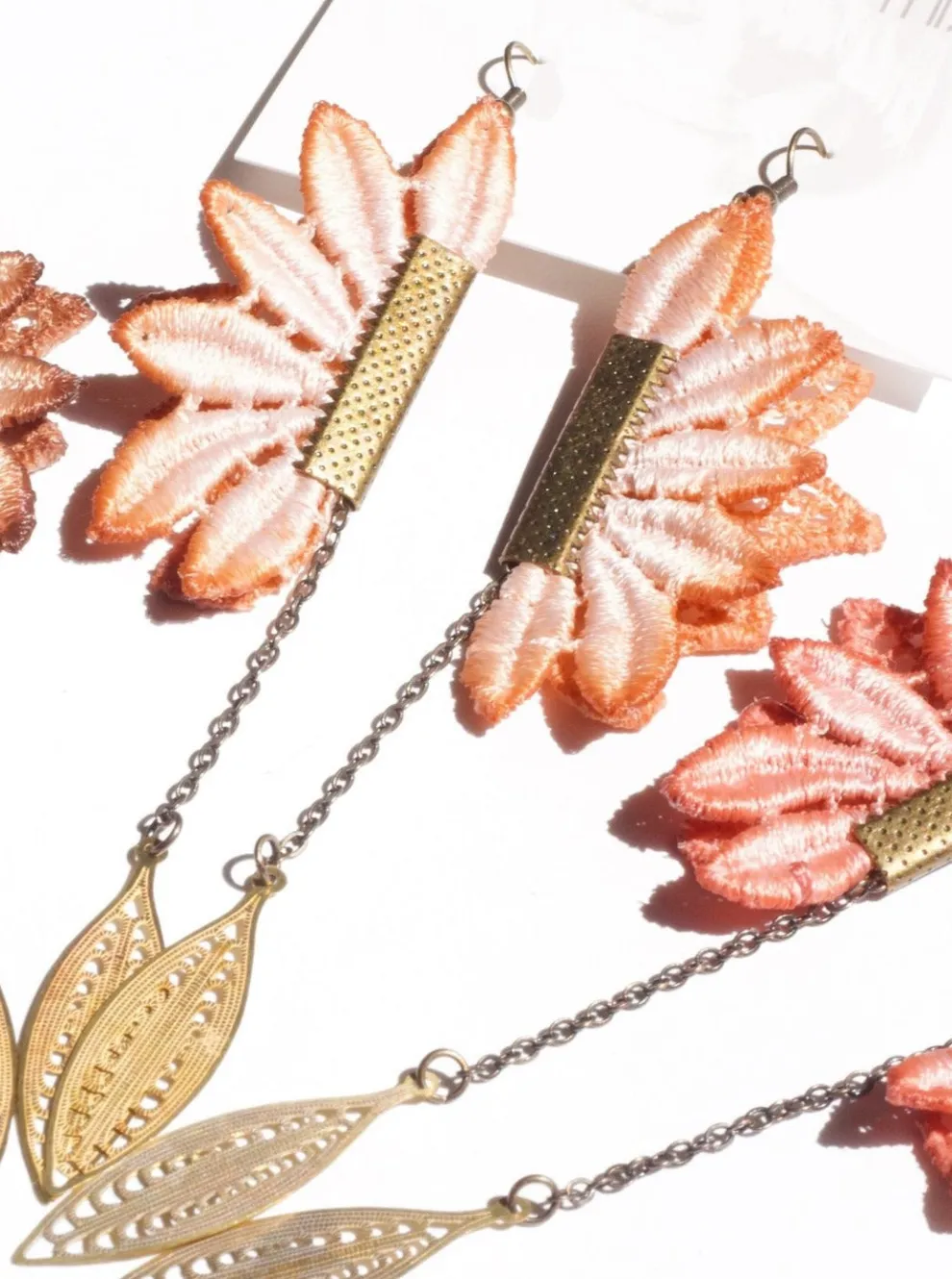 The Pendulum earrings feature hand-dyed vintage lace and a long bronze chain, adorned with a vintage bronze pendant.