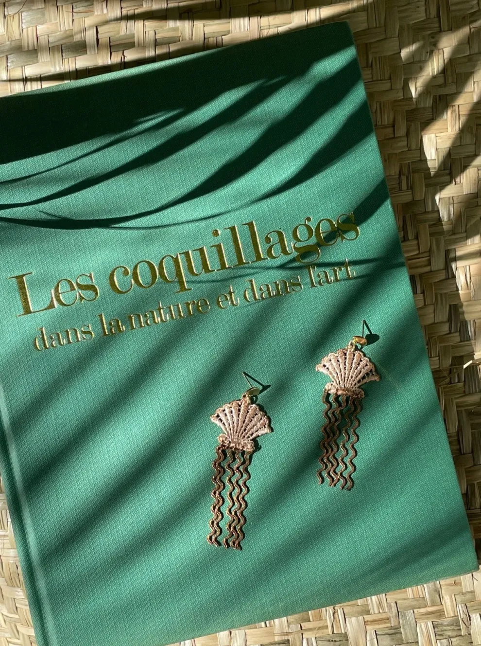 Very lightweight shell inspired earrings made from tiny wavy vintage copper chain fringes cascading from thick hand dyed vintage lace. The lace shells are lightly reinforced for structure and hang from gold-plated semi-circle stud earrings with gold-plated stainless steel posts.